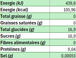 Vin blanc (raisins, conservateurs E220 (sulfite), E224 (sulfite), E228 (sulfite), E300, stabilisant E353), miel, mélange d’épices.